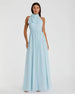 This elegant chiffon gown features a pleated bodice, high neckline with a self-tie bow, a pleated waistband, and an elegant flowing skirt.